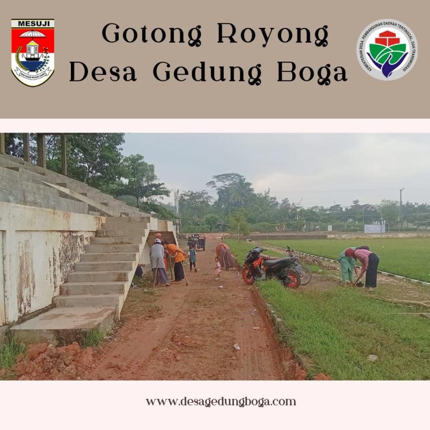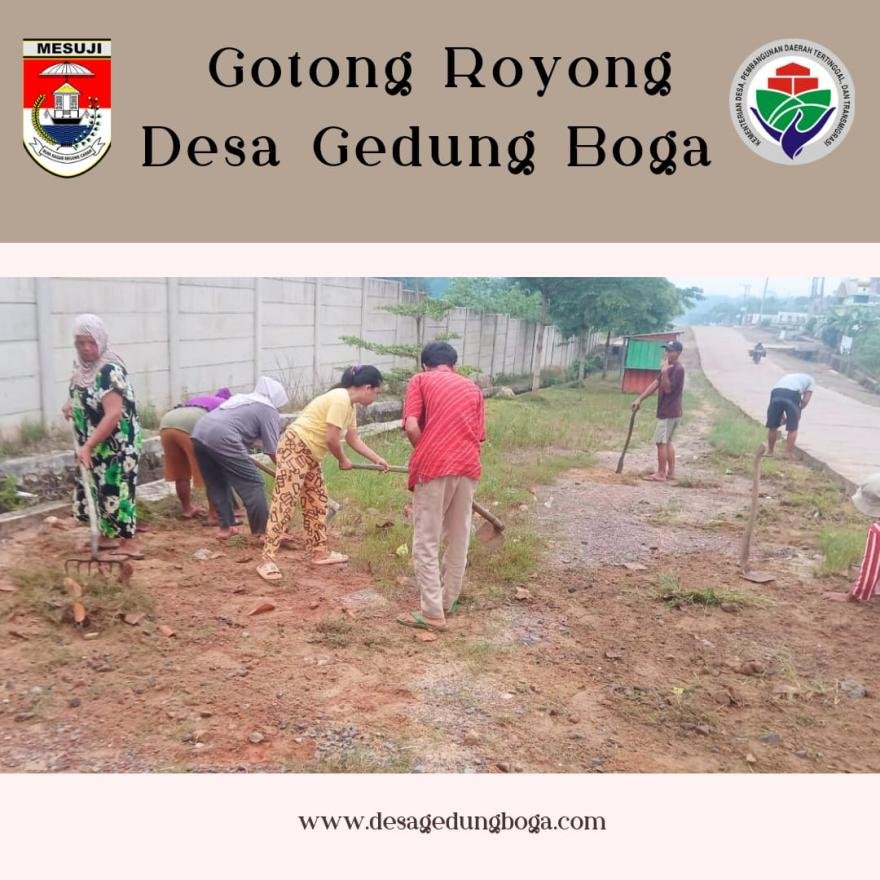 Rutinitas gotong royong para warga Desa Gedung Boga terus dikebut. warga nampak sedang bahu membahu.