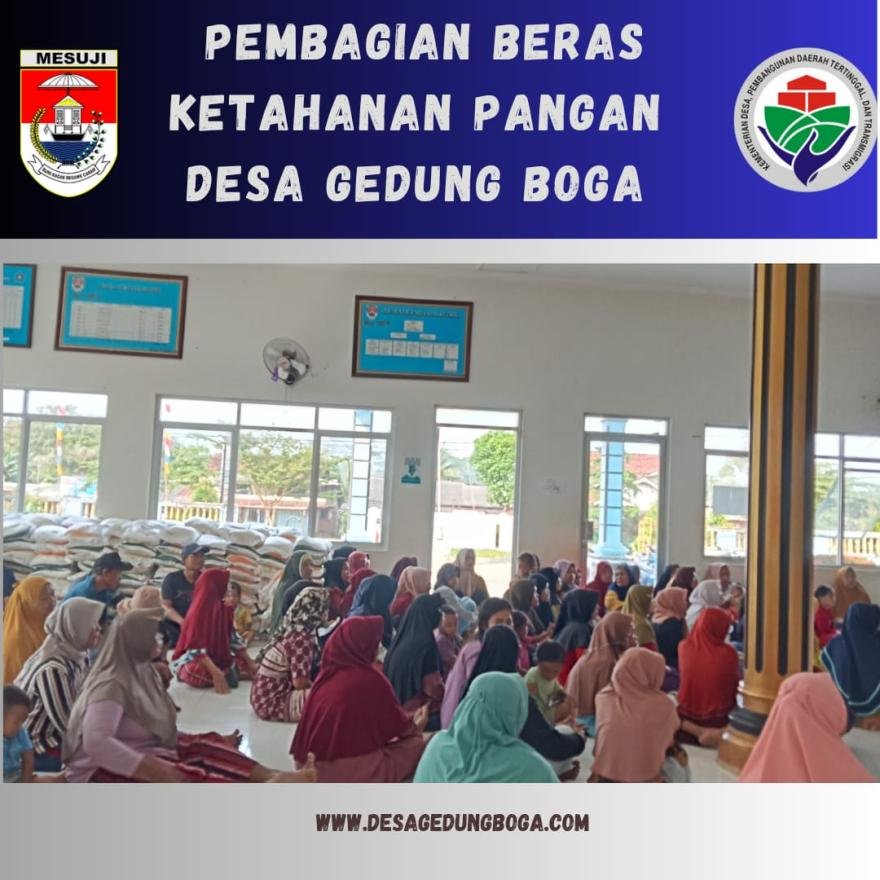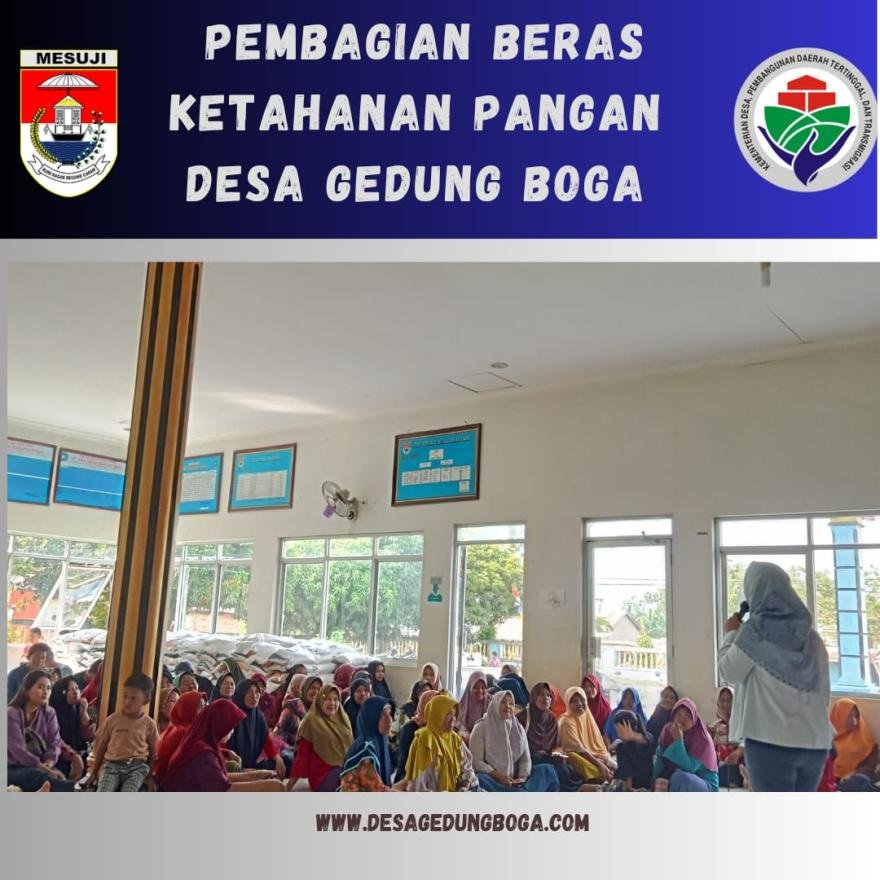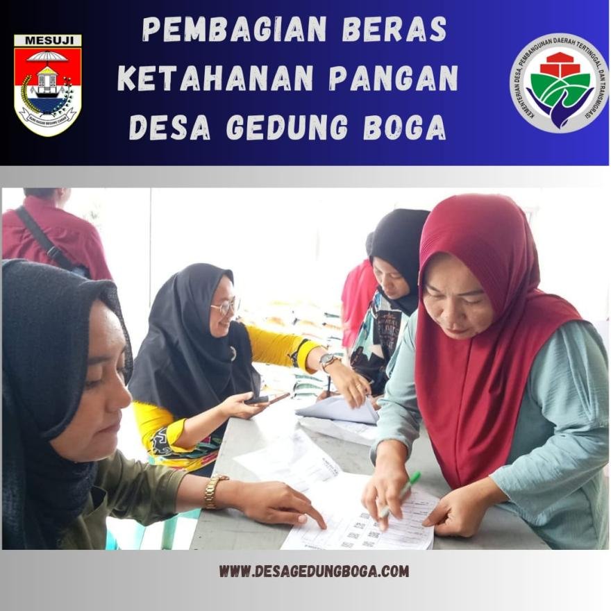 Penyaluran beras juga langsung dibagikan oleh Kepala Desa Gedung Boga ibu Hj Yulida Sriwahyuni S.Pd beserta aparatur desa lain nya. Dengan adanya pembagian Bantuan beras ketahanan pangan semoga dapat bermanfaat bagi yang menerima.