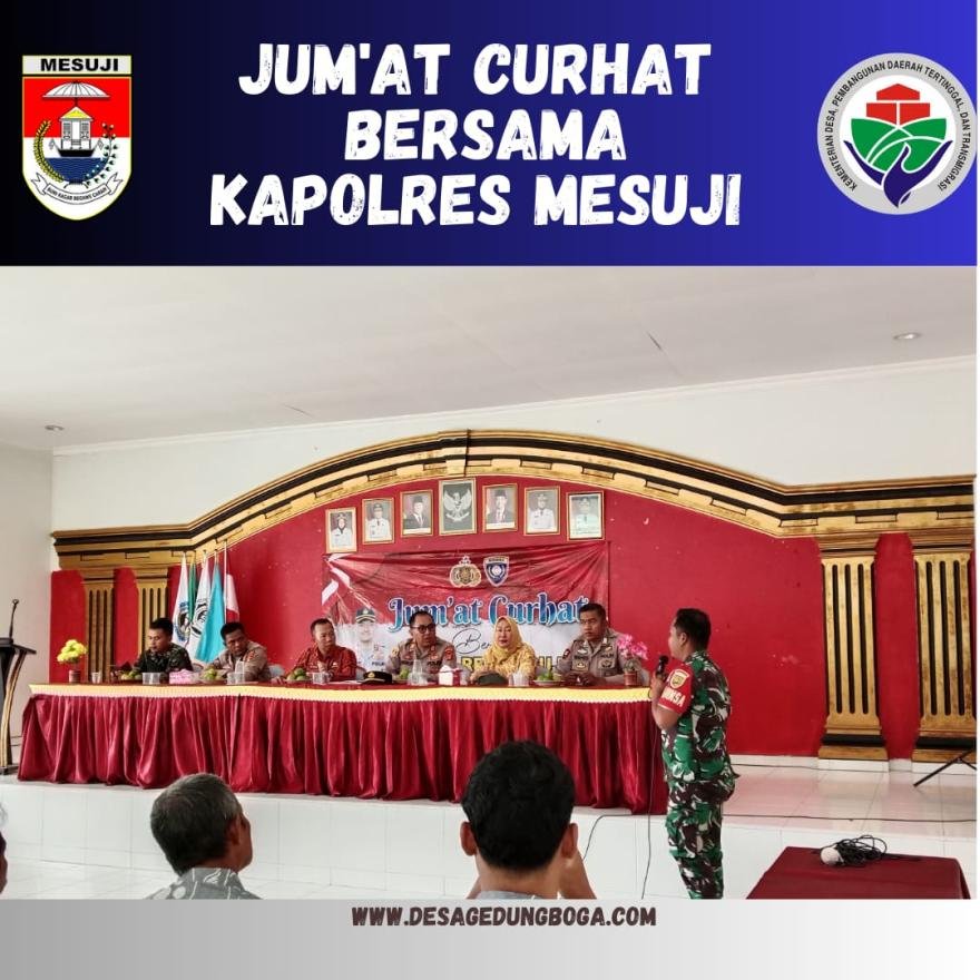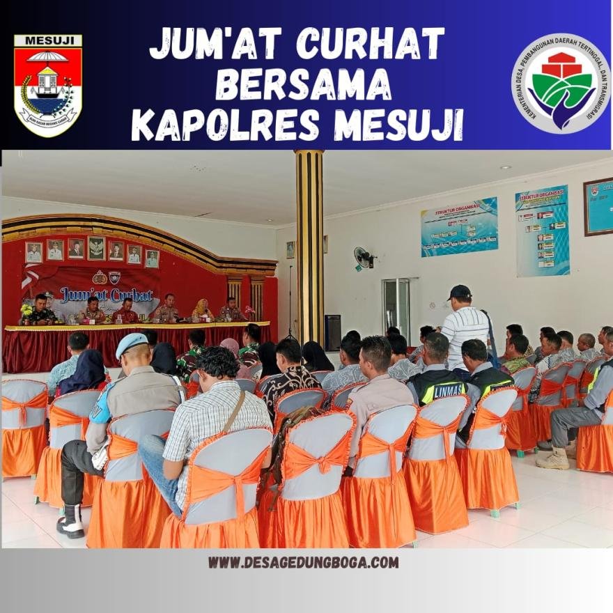 Lalu dilanjutkan dengan kegiatan JUM'AT CURHAT BERSAMA KAPOLRES MESUJI, beserta jajarannya, Polsek Way Serdang beserta jajarannya, Danramil, Bapak Sekertaris camat way Serdang, besertaanya Kepala Desa Gedung Boga Ibu HJ,YULIDA SRIWAHYUNI, S. Pd,dan masyarakat Desa.